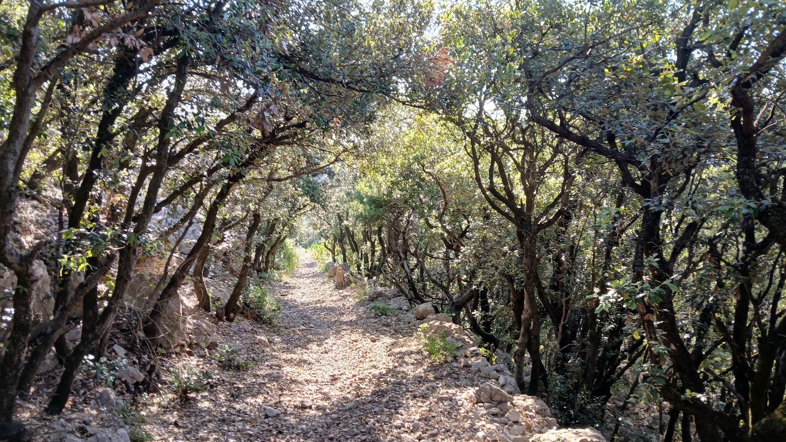 At the bottom of the Cirque de l’Infernet, nearly at our destination, Saint Guilhelm le Désert. So hot! we are walking through burnt woods.
